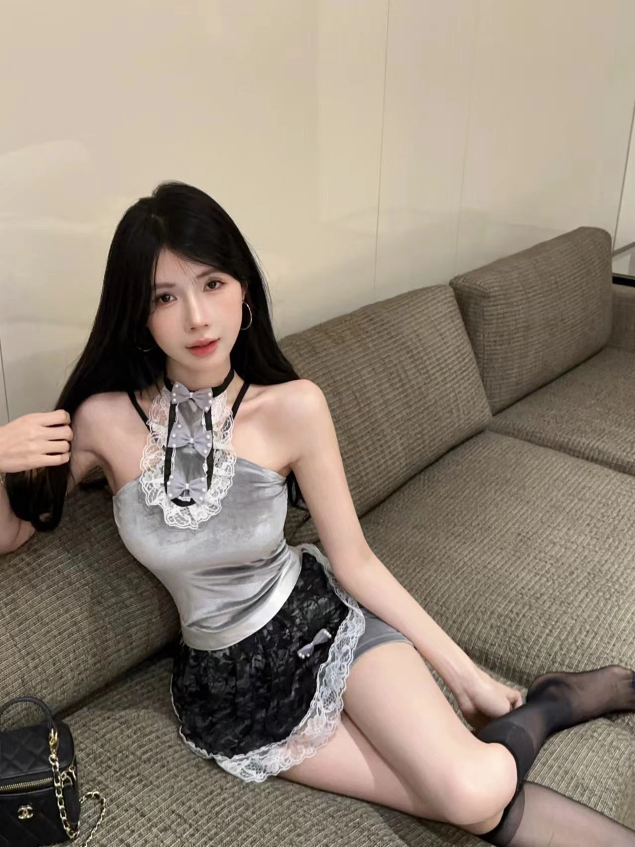 Vintage-Inspired Grey Velvet Date Nights Mini Dress Lace Apron Bow Details Short Dress AP1764