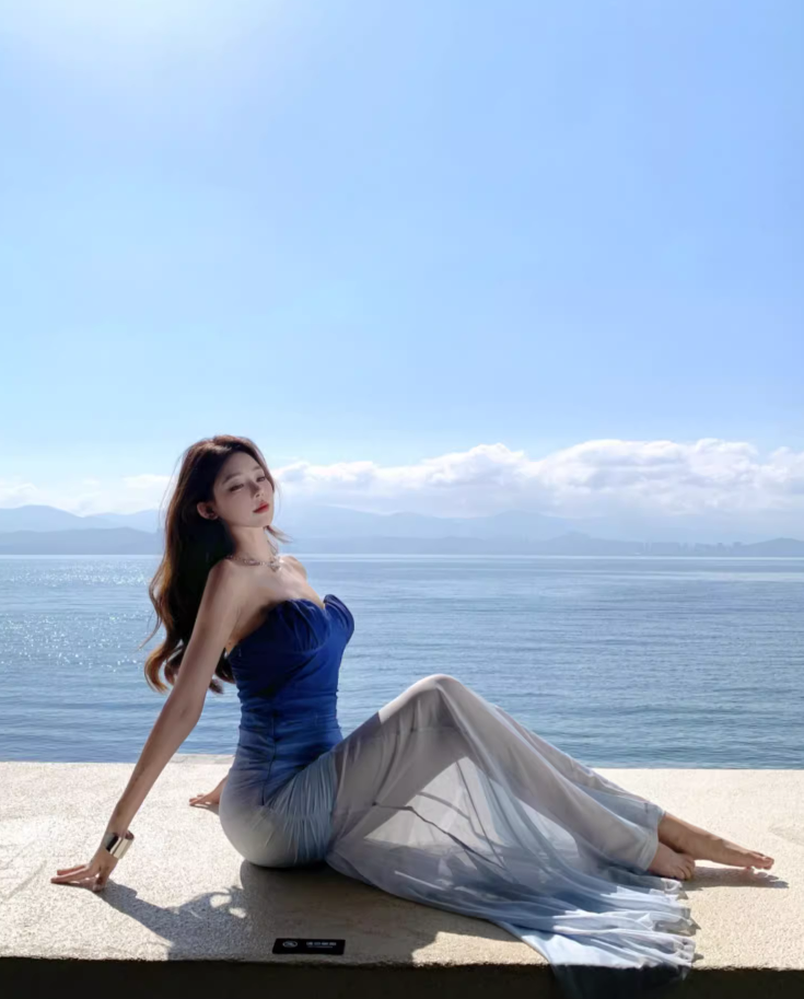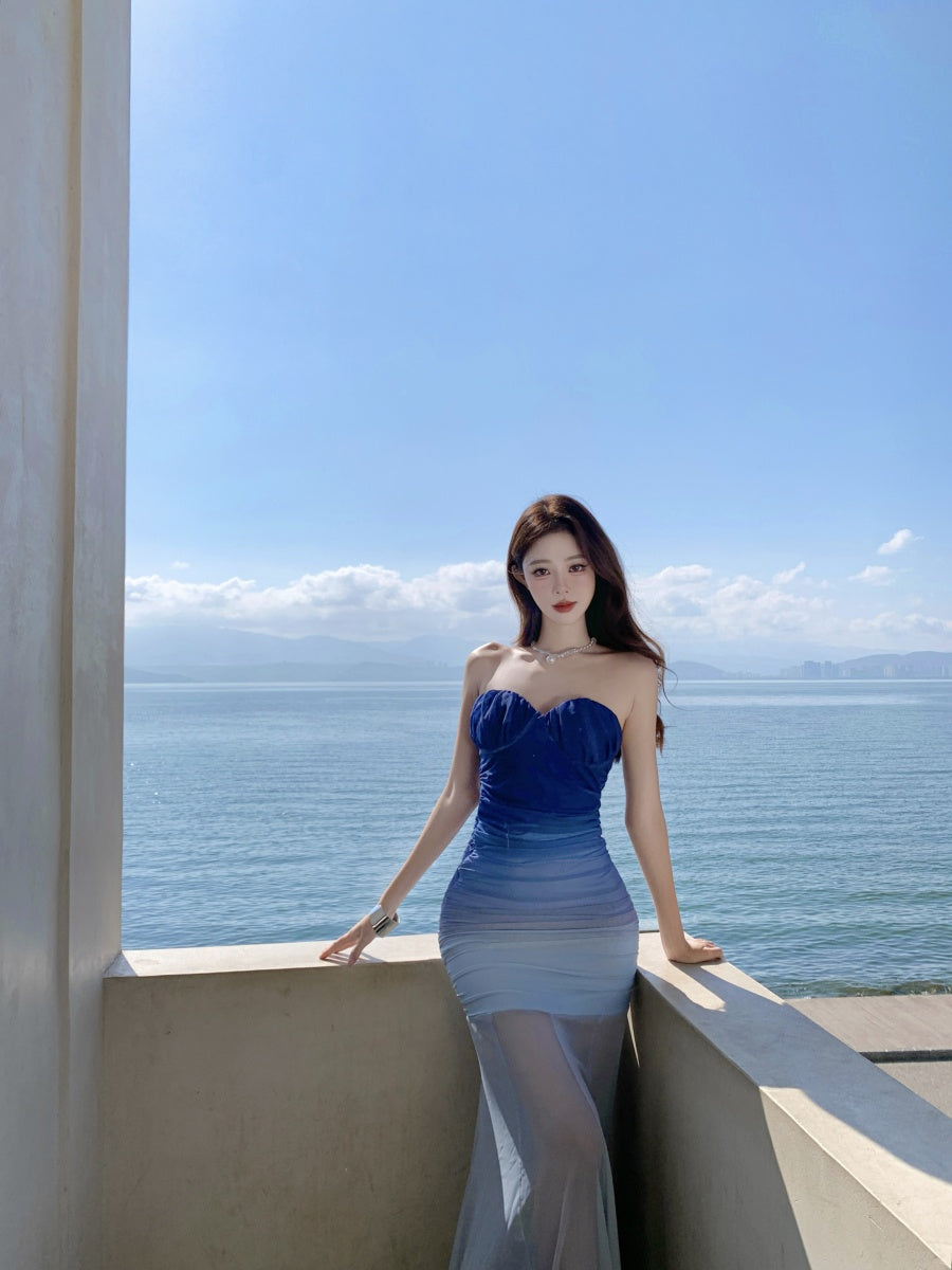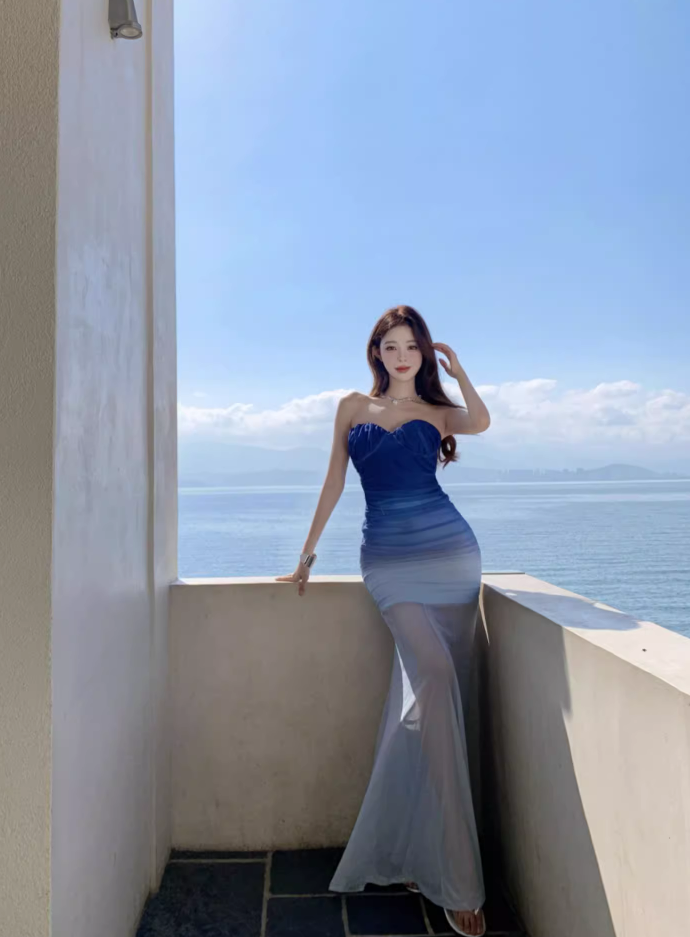 Ethereal Strapless Sheer Mesh Overlay Maxi Dress Blue Gradient Photographic Long Dress AP1161