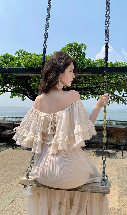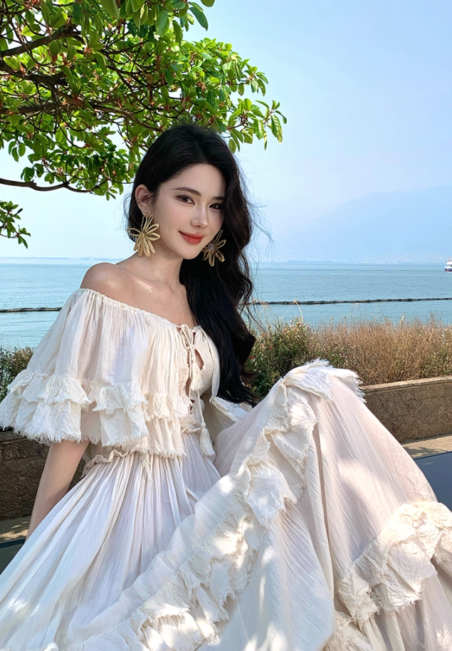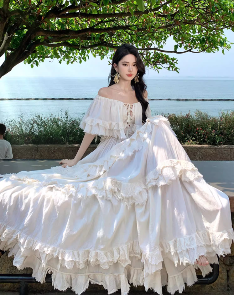 Ethereal Off-Shoulder Tiered Ruffles Maxi Dress Elegant Cream Flowy Silhouette Long Dress AP1168