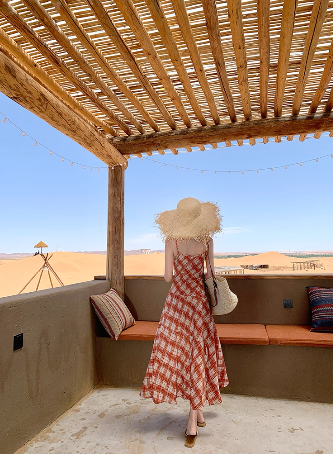 Vibrant Travel Photo Plaid Print Maxi Dress Spaghetti Strap Slit Flattering Long Dress AP0695